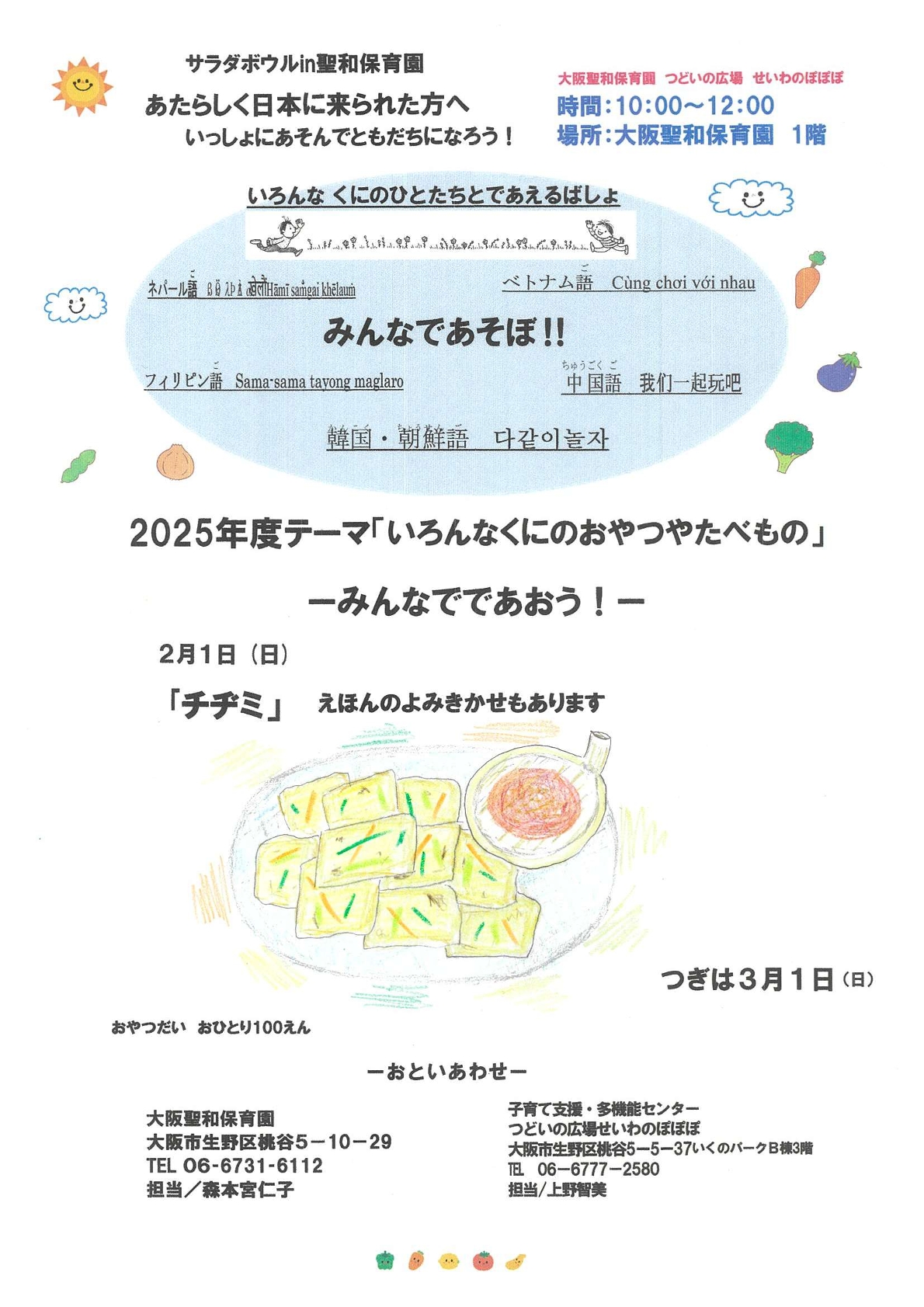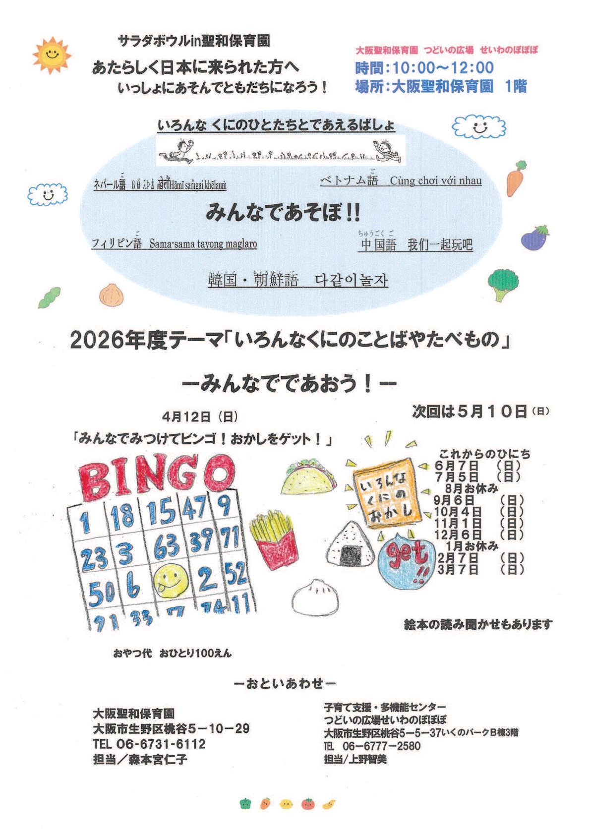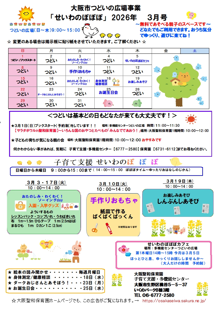 大阪聖和保育園のホームページへようこそ。 大阪聖和保育園は大阪市生野区にある認可保育園です。キリスト教主義の「(遊びを中心とした)自由保育」を基本とした、「縦割り保育」「民族保育」「障がい児保育」などに取り組む保育園です。 所在地は、JR西日本 大阪環状線「桃谷駅」から徒歩で約15分、鶴橋駅からは徒歩で約20分「大阪コリアタウン」の近くにあります。
