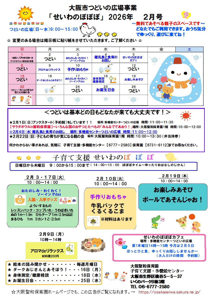 ☆大阪市一時預かり事業(基幹型):9:00~17:00/申込書と利用料金が必要(延長保育: 7:30~9:00、17:00~18:30/別途料金が必要)