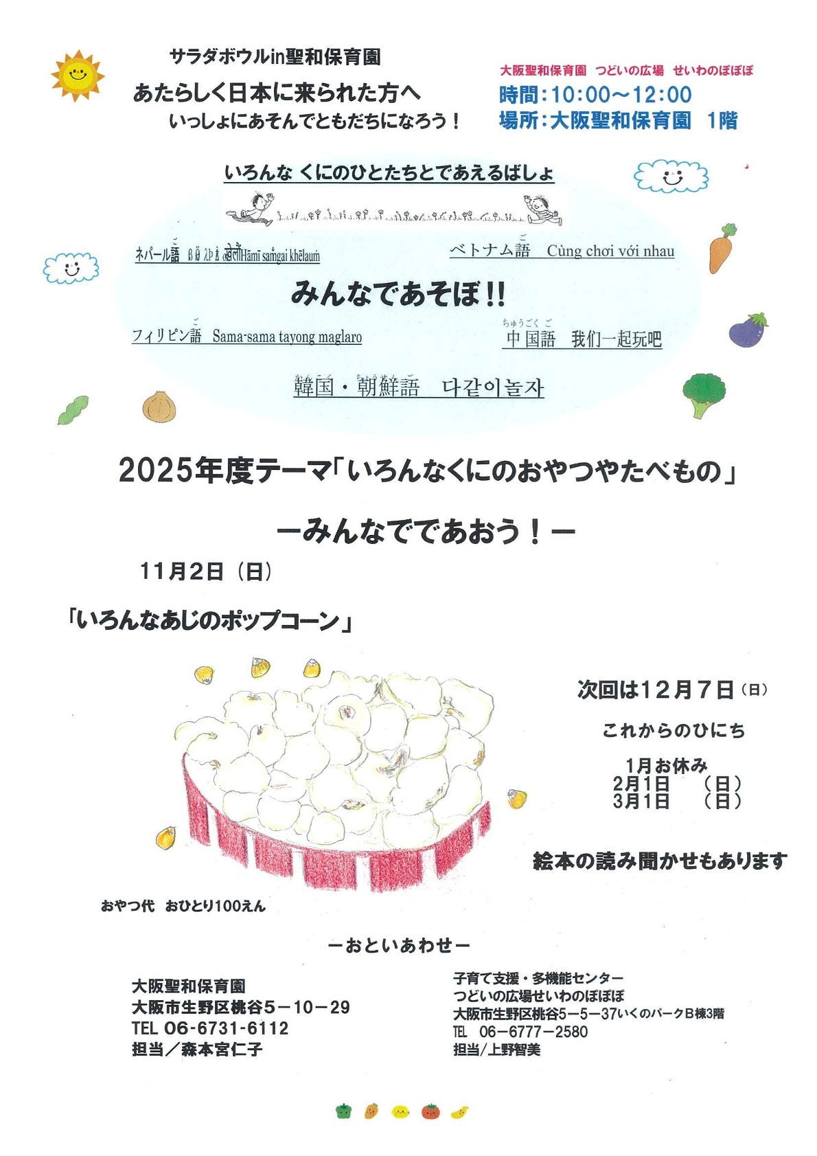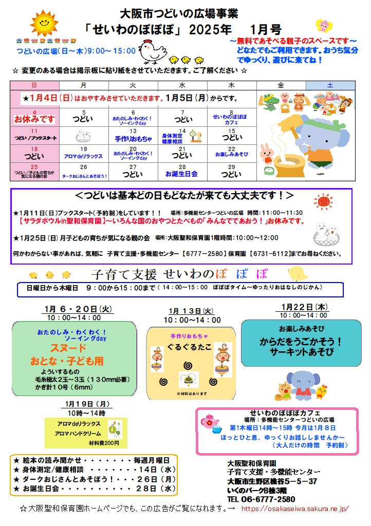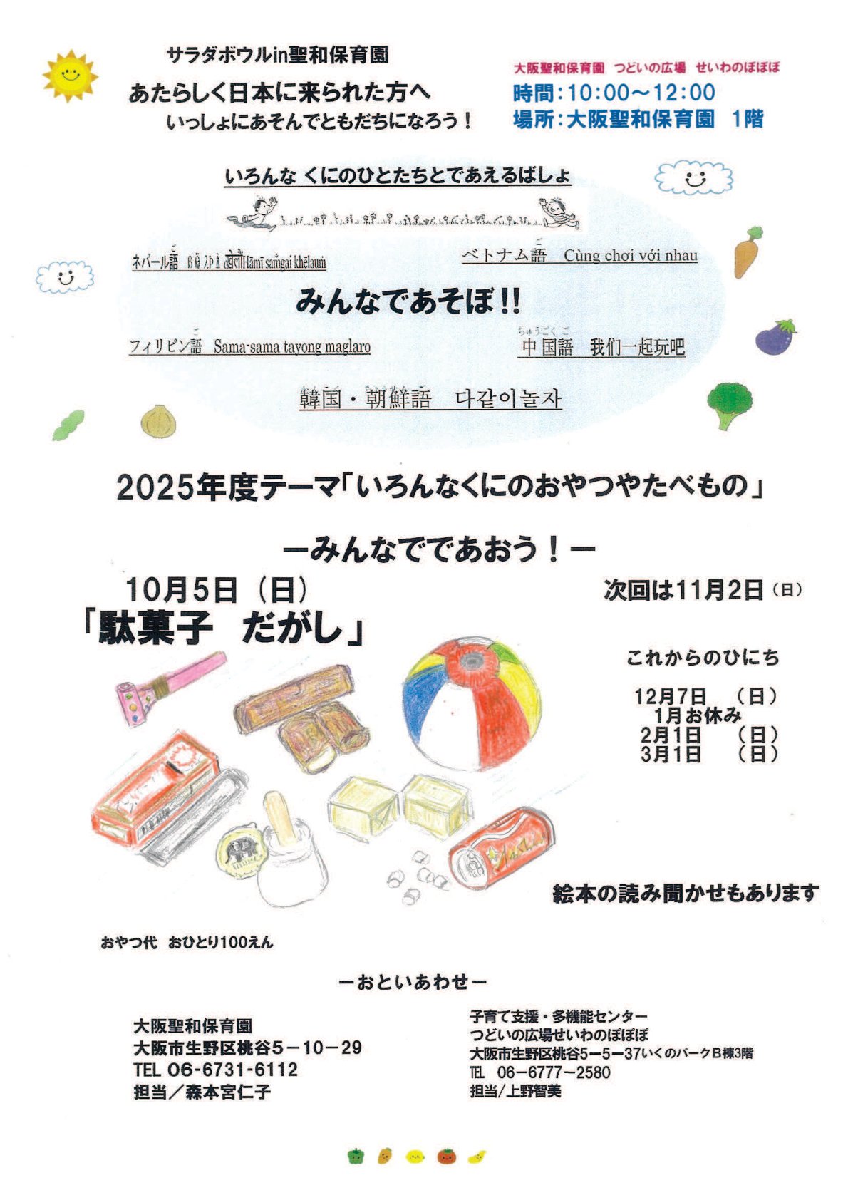 大阪聖和保育園のホームページへようこそ。 大阪聖和保育園は大阪市生野区にある認可保育園です。キリスト教主義の「(遊びを中心とした)自由保育」を基本とした、「縦割り保育」「民族保育」「障がい児保育」などに取り組む保育園です。 所在地は、JR西日本 大阪環状線「桃谷駅」から徒歩で約15分、鶴橋駅からは徒歩で約20分「大阪コリアタウン」の近くにあります。
